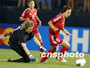 女足世界杯比赛于北京时间九月二十九日中午进行了D组的最后一场比赛中,中国队1比0战胜俄罗斯队,积7分以小组第一身份出线,进入八强。图为孙雯在比赛中突破晃过俄罗斯队守门员,可惜被判为越位。作者:刘占坤