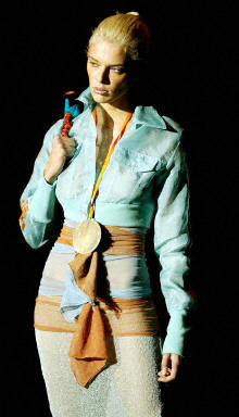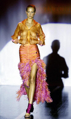 9月29日,在意大利米兰2004春夏时装周上,模特现场展示了哥伦比亚设计师Lidia Cardinale的新作。米兰时装周将与10月5日结束。
