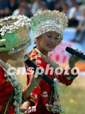 贵州省黔东南自治州苗族姑娘在国庆黄金周里以优美的传统山歌迎接游客。这个民族的青年男女有以歌传情、以舞达意的风俗。中新社记者:宋吉河