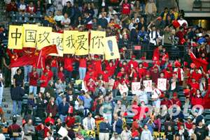 北京时间10月3日,在2003女足世界杯四分之一决赛中,中国女足0比1不敌加拿大队,抱憾告别本届世界杯。图为在波特兰的中国留学生和华人华侨组成的啦啦队打出横幅为中国队加油。作者:刘占坤