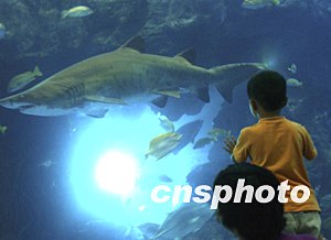 十月黄金旅游假期的海滨大连海洋公园里,母子观赏水中鲨鱼。中新社记者:贾国荣