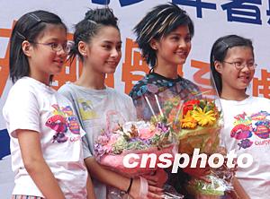 香港乐坛人气组合TWINS,十月四日出席在香港理工大学举办的青少年体育嘉年华活动,两名理大学生向TWINS献花。中新社记者:钱兴强
