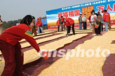 “十一国庆节”假日,在北京地坛公园举办的2003年北京书市上,《北京青年报》社在地坛祭坛400平米台上,举行《祝福祖国》万人拼图暨发行宣传周活动,吸引数以千计民众参与。她们将玉米、红豆、黄豆、绿豆等五谷杂粮洒下,铺成巨大的“祝福祖国”词组,愿祖国大地五谷丰登。中新社记者:邹宪
