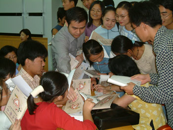 华夏爱心团爱心专员、著名画家李繁民向合工大的爱心志愿者组织赠送了现场即做的巨画“鹏程万里”图。演讲结束后,太阳星城爱心之旅采访团向合工大赠送了来自民间的思悟录——〈牵手爱心〉,大学生们将周永琴、赵玉芝、宋体金、李繁民团团围住,请他们签字留念。