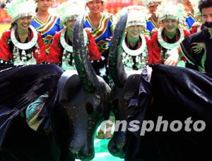 贵州省黔东南自治州苗族青年节日期间为游客表演斗牛歌舞,展示当地民族传统文化,丰富旅游内容。中新社记者:宋吉河