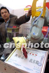首届中国租赁业推广展览会八日在北京展览馆拉开序幕,来自国内外四十八家企业及制造商云集一堂。北京一家科技有限公司推出可以写字、拍照、摇奖的智能机器人租赁业务,每日三千元的租赁价格吸引了不少参观人员。中新社记者:廖文静