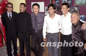 港产电影《无间道Ⅲ终极无间》10月9日在香港特别安排传媒采访探班,曾志伟、刘德华、梁朝伟、黎明、陈道明、黄秋生(右起)六大影帝聚首一堂。中新社记者:邓庆乐