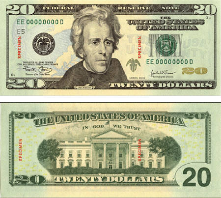 新版美钞保持了传统美钞的外貌,尺寸亦没有改变,钞票的正反面也仍然是安德鲁·杰克逊的图像和白宫的图案,只是色彩有所增强。新版二十美元是美国近代史上首次用多种颜色而非单一绿色印刷的钞票,除了传统的绿色以外,钞票底色是桃色,上有蓝色的鹰形图案和铜色数字。