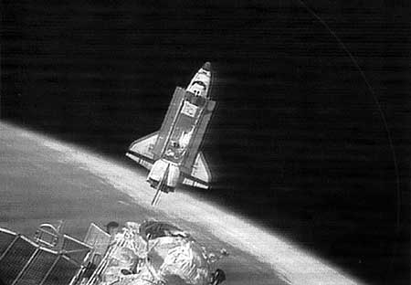 1995年2月6日,在距地面395公里的空间轨道上,美国“发现”号航天飞机与俄罗斯“和平”号轨道空间站实现美俄两国航天飞行器械的历史性会合。在此期间两者相靠距离最近达11.3米。新华社图