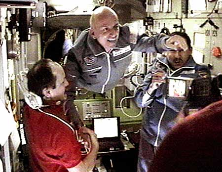 2001年4月30日,第一位太空游客、美国人蒂托(中)快乐地进入国际空间站,开始了他为期一周的太空观光生活。太空旅游的开辟使得普通人也能够像宇航员一样畅游星际之间。新华社图