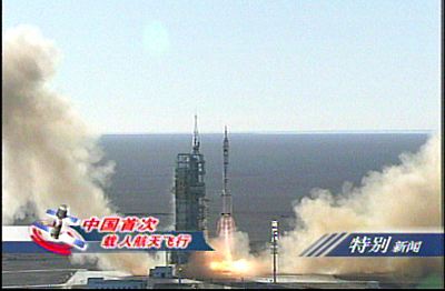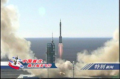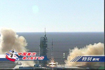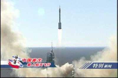 北京时间十五日上午九时整,“神舟”五号载人飞船由“神箭”——“长征二号F”运载火箭从酒泉卫星发射中心载人航天发射场发射升空,“神箭”升空十多分钟后,中国载人航天工程指挥部总指挥宣布,“神舟”五号载人飞船已成功进入预定轨道,发射取得成功。