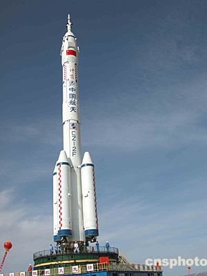 转运途中的“神舟”五号载人飞船船箭塔组合体直指苍穹(二)。中新社记者孙自法摄