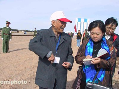 八十八岁高龄的中国老一辈航天人任新民老先生在“神舟”五号载人飞船垂直转运现场兴致勃勃地接受记者采访。中新社记者孙自法摄