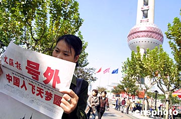 十五日上午,中国自行研制的“神舟”五号载人飞船,在酒泉卫星发射中心发射成功,这一历史性时刻受到中国亿万人民的关注。图为上海市民关注发射成功的新闻报道。作者:汤彦俊