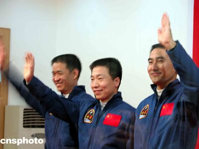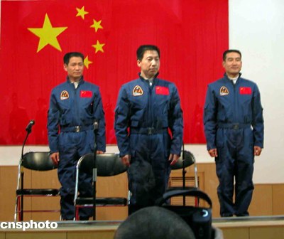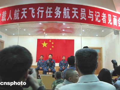 “神舟”五号载人飞船发射前夕,中国首次载人航天飞行航天员梯队的三名航天员杨利伟(中)、翟志刚(右)聂海胜与记者见面,并回答记者提问。这也是中国航天员首次公开亮相。中新社记者孙自法摄