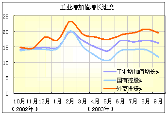 五大行业成为带动工业生产快速增长的主要力量。9月份,通信设备、计算机及其他电子设备制造业、交通运输设备制造业、冶金工业、电气机械及器材制造业以及化学工业等5大支柱行业总产值均保持了20%以上的快速增长,对整个工业增长的贡献率达到52.4%,拉动增速8.5个百分点。其中冶金工业受钢和钢材的加快增长,使行业总产值增速比上月加快5.9个百分点。当月全国钢和钢材产量同比增长26.1%和24.3%,分别比上月加快3.7和5.3个百分点。从其他行业主要产品看,电子计算机、微机产量分别增长2.4倍和1.1倍。汽车生产再创新高,当月产出42.76万辆,为今年以来最高月产水平,比上年同月增长36.8%;其中轿车月产量首次迈上19万辆新台阶,达到19.13万辆,比上月增产2.2万辆,同比增长69.7%。