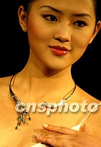 第三届中国珠宝首饰设计大奖赛十五日在北京揭晓,新丝路名模肖青在颁奖仪式上展示获得有色宝石组一等奖的项饰“风姿灼烁”。作品既有华丽的外表,也有精练的内涵,雍容高雅,把尊贵和时尚融入一体。来自中国内地、香港、台湾等地区的近两千件作品参加了比赛。中新社记者:毛建军