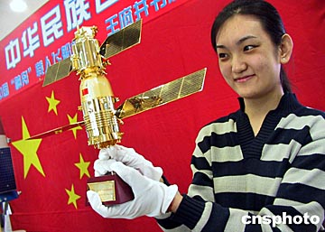 十月十六日清晨,中国首次载人航天飞行获得圆满成功,一位姑娘手捧刚刚买到的24K镀金“神舟”五号载人飞船模型,激动地在北京王府井向路人展示。中新社记者:张勤