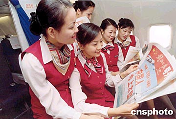 十月十六日,中国首次载人航天飞行取得圆满成功,上海航空公司的空姐争看有关报道,分享中国人首次上太空的喜悦。作者:夏本建
