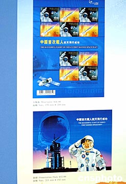10月16日,中国邮政、香港及澳门邮政联合发行“中国首次载人航天飞行成功”纪念邮票。图为在香港发行的小版张和套折。作者:洪少葵