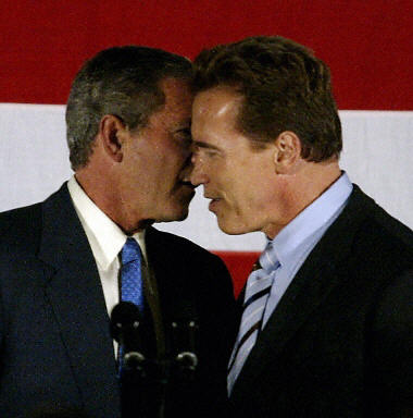 据路透社消息,布什同施瓦辛格进行了一个半小时的私人会面,随后两人前往圣博纳迪诺向公众发表演讲。演说中,布什称与施瓦辛格有着众多“共同语言”。
