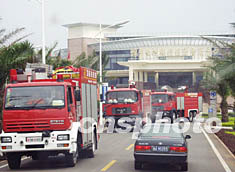 海南十月十七日举行博鳌亚洲论坛安保演练,迎接十一月初召开的论坛年会。图为消防车在会议接待酒店博鳌索菲特酒店前进行消防演练。作者:王辛莉
