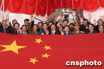 十月十八日,中国“神舟”五号载人飞船返回舱搭载物品开舱仪式在中国航天科技集团公司北京空间技术研制试验中心举行。随载人飞船在太空翱翔二十多小时的巨幅五星红旗从神舟五号载人飞船返回舱中被取出。中新社记者 张炜摄