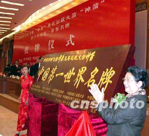 中国工业经济联合会等十个工业行业协会和联合会十八日在北京人民大会堂举行仪式,为“神舟”、“神箭”的中国第一世界名牌授牌。