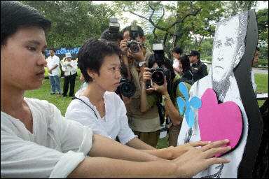 在本周五泰国农民的游行队伍中,一位老者将布什的照片塞入一个铁罐后封了口,并将铁罐投入泰国北部的一条河中。据称,这是古代高棉地区的一种下降头的方法。