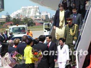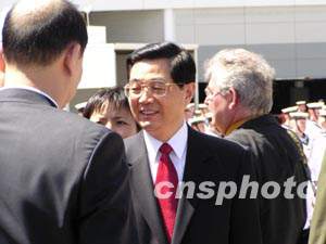 中国国家主席胡锦涛和夫人22日上午10时许抵达悉尼国际机场,对澳大利亚进行国事访问,受到澳联邦总督杰弗里和总理霍华德等热烈欢迎。中新社记者 刘雨生 摄