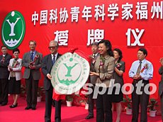 中国科协青年科学家福州活动基地二十三日举行隆重的授牌仪式。中共中央委员、中国科协副主席张玉台(前左一)宣布“福州基地”成立,并与中共市委副书记雷春美(右一)共同向“福州基地”授牌。“福州基地”是中国科协在全国设立的第二个青年科学家活动基地,旨在为海峡两岸青年科学家搭起科技交流、合作的新平台。中新社记者:刘可耕