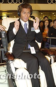 古天乐同场感受OSIM全球首张拥有音乐与按摩功能的音乐按摩椅。中新社记者:邓庆乐