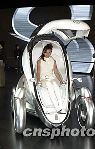 日本汽车龙头企业丰田公司在东京国际汽车展上推出专门为2005年日本爱知世博会设计的新概念车,这种一人单乘的新概念车车身角度可自由升降,构成不同的精美造型。中新社记者:王健