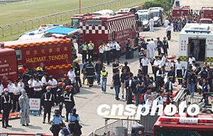 香港警方“雷霆”反恐演习10月24日在沙田马场进行,演习模拟马场受到沙林毒气和爆炸装置袭击,警方和其它部门迅速到场处理,将伤者送往医院。中新社记者:洪少葵