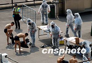 警方冲锋队为受到毒气袭击的伤者现场消毒清洗。中新社记者:洪少葵