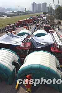 来自保安局、消防处、医院管理局、医疗辅助队、民安队、天文台、卫生署和赛马会共1300多人参与此次演习。中新社记者:洪少葵