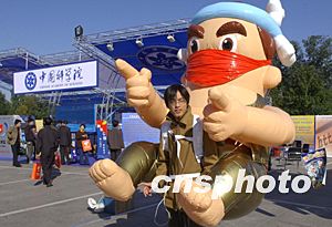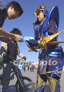来自韩国、日本等地的互联网游戏提供商与中国网络游戏企业摆开阵势,“一决高下”。图为网络游戏人物向参观者派发产品资料。中新社记者:张炜