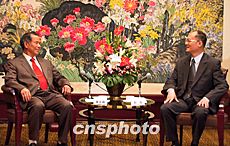 国务院侨办副主任赵阳(图右)24日在重庆会见菲律宾著名华人实业家陈永栽,赵阳表示,陈永栽先生投资设立的新联商业银行重庆分行将对重庆乃至西部地区经济发展起积极作用。作者:邹辉