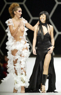 当地时间10月25日,葡萄牙首都里斯本举行2004年春夏时装展。图为模特在展示葡萄牙设计师Fatima Lopes设计的时装。