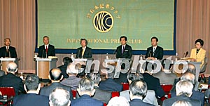 日本众议院选举将于28日正式开锣,日本政界六个政党的首领(左起依次为保守新党代表熊谷弘、公明党代表神崎武法、自民党总裁小泉纯一郎、民主党代表菅直人、共产党委员长志位和夫、社民党党首土井多贺子)27日在日本记者俱乐部共聚一台唇枪舌剑。作者:王健