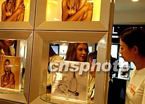 参加中国新丝路世界模特大赛的俄罗斯小姐,十月二十八日逛杭州大厦商场,采购法国名牌香水。中新社记者:贾国荣