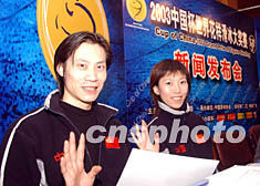 2003年中国杯世界花样滑冰大奖赛将于十一月初在北京举行,来自十四个国家的六十四名优秀运动员将参加这一重要国际赛事的角逐。图为刚刚在美国站比赛中获得双人滑冠军的中国选手庞清、佟健在二十九日举行的新闻发布会上。中新社记者:武仲林
