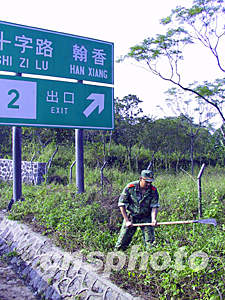 在海南东线高速公路海口段,远远看见政府某执法部门的一行工作人员,手持长柄割刀,在清理路旁隔离带内高过人头的杂草。经询问,原来是为了清理视线障碍,确保参会政要、前政要,以及业界领袖们的交通安保工作无死角。