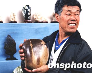 山西省垣曲有一位奇石收藏爱好着,不久前他在黄河小浪底水库中发现了一颗圆石头,石头上有一个和“神州五号”载人火箭升空时的情景异常相似。2003年10月下旬,他为庆祝“神州五号”的发射成功,特将这块奇石拿出来进行展览。张旦 摄