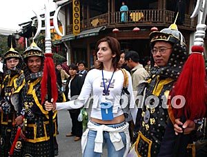 参加新丝路世界模特大赛的外国小姐,十月三十日游览杭州河坊街时,扮作古代护城的中国武士。中新社记者:贾国荣