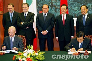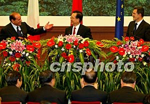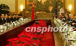 中欧领导人第六次会谈三十日在北京举行。中国国务院总理温家宝、欧洲理事会主席意大利总理贝卢斯科尼、欧盟委员会主席普罗迪等出席会谈。郑萍萍 摄