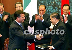 中国与欧盟三十日在北京签署伽利略卫星导航合作协定等三个文件。中国国务院总理温家宝、欧洲理事会主席意大利总理贝卢斯科尼(后左三)、欧盟委员会主席普罗迪(后左二)、欧盟共同外交与安全政策高级代表索拉纳(后左一)共同出席签字仪式。郑萍萍 摄