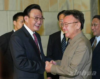 吴邦国首先转达了胡锦涛总书记、江泽民主席、温家宝总理对金正日的亲切问候。他说,中朝两国领导人有着经常来往的传统。过去几年里,您两次访华,江泽民同志访朝,都有力地推动了两国友好关系的发展。胡锦涛总书记期待着您在方便时再次访华。