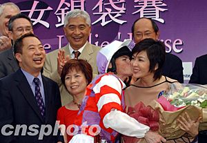香港妇女银袋赛十一月二日在沙田马场举行,获得该赛头马的骑师亲吻影星关之琳。中新社记者:潘索菲