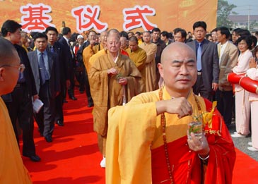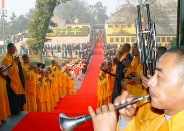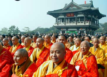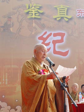 昨天在大明寺栖灵塔下举行了盛大的纪念大会。来自国家、江苏省有关方面的官员,鉴真东渡经过及学习过的寺庙之诸山长老法师及港澳台和日本的客人数千人参加了大会。纪念大会由扬州市委副书记、常务副市长洪锦华主持,中央统战部副部长朱维群、国家宗教事务局局长叶小文、中日友好协会副会长文迟、中国佛教协会副会长学诚法师、江苏省副省长何权、省委统战部副部长、省宗教事务局局长翁振进、省台办副主任潘朗哉、省对外友协副会长、省佛教协会会长明学法师、日本驻沪总领事杉本信行、日本奈良唐招提寺益田快范长老、台湾佛光山开山宗长星云、香港大学副校长、中国工程院院士李焯芬,扬州市府官员孙志军、季建业、徐益民等参加了大会。